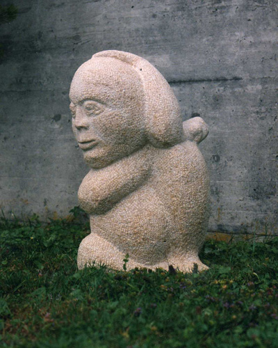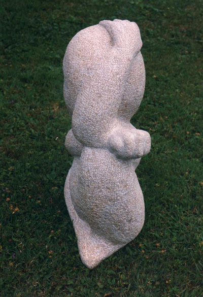 Eine Form fühle oder sehe ich von der Innenseite her. Die Aussenseite ist die Konsequenz der innerlichen Manifestation. Materie ist die Verdichtung von Energie. Wer oder was sitzt im Stein? Ich hacke es heraus, bis ich „die Haut“ des Kerns berühre. Jede Form hat ein Energieniveau. Durch das „Herausschälen“ dieser bestimmten Energie hole ich die Form nach Aussen, deute und benenne sie. So kommt die Skulptur zu ihrem Namen. Mit Worten kann ich die „Consuela-Energie“ nicht beschreiben.