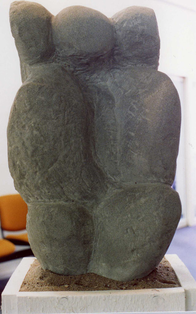 Eine Form fühle oder sehe ich von der Innenseite her. Die Aussenseite ist die Konsequenz der innerlichen Manifestation. Materie ist die Verdichtung von Energie. Wer oder was sitzt im Stein? Ich hacke es heraus, bis ich „die Haut“ des Kerns berühre. Jede Form hat ein Energieniveau. Durch das „Herausschälen“ dieser bestimmten Energie hole ich die Form nach Aussen, deute und benenne sie. So kommt die Skulptur zu ihrem Namen. Mit Worten kann ich die „Consuela-Energie“ nicht beschreiben.